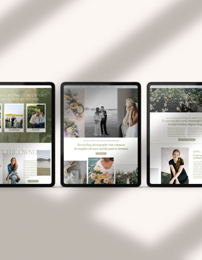 I’m so excited to share another beautiful Trust Me Package launch — this time for Emily Elizabeth Photography! Emily is a talented Tennessee wedding and family photographer who wanted to uplevel her brand and website to better reflect her work and experience. She envisioned a design that felt cool, calm, and elevated for her wedding photographer brand design, featuring a sage and dusty blue color palette to match her timeless, romantic photography style.