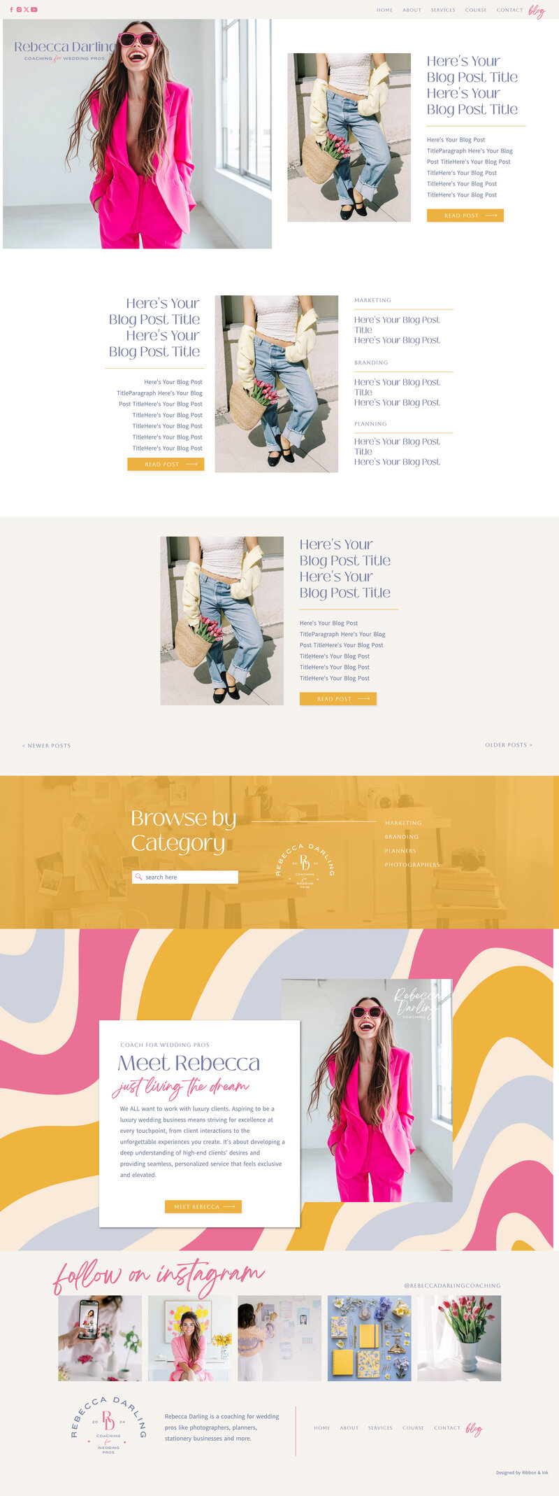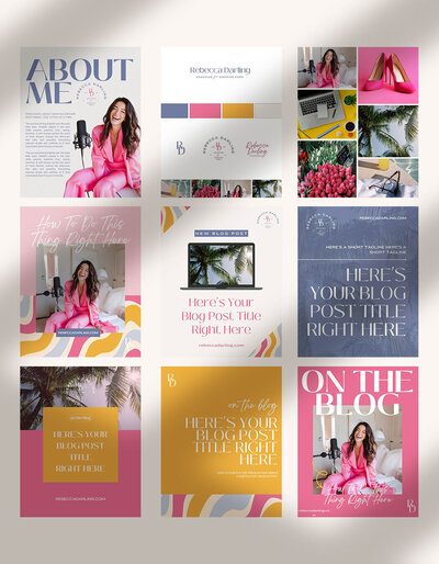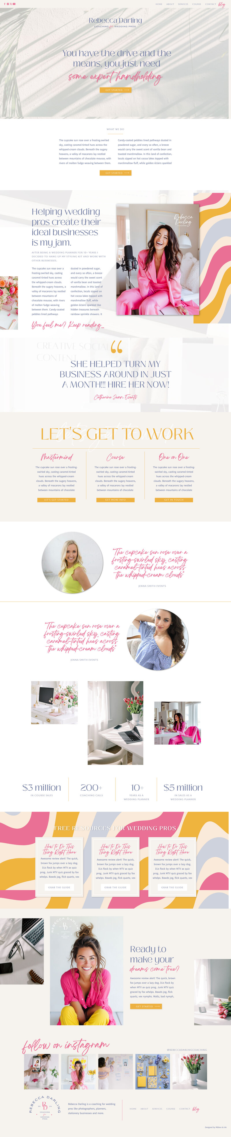 The Rebecca is a coach-inspired, colroful Showit website template perfect for the podcaster or biz coach. It features a serif and script font (that you will need to purchase separately to legally use on your website) and yellow, blue, and pink color palette (that you can change).